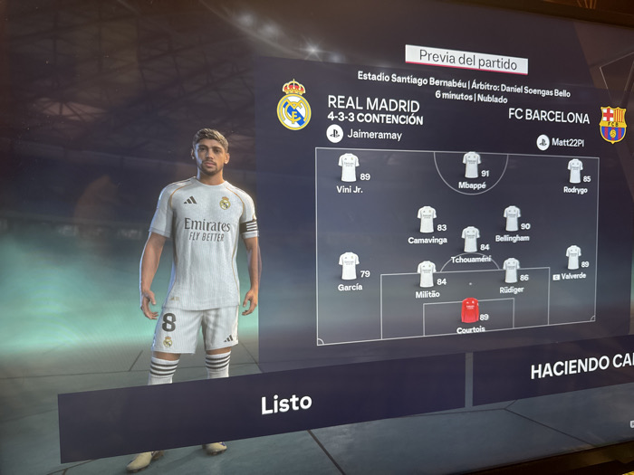 The image depicts a digital screen displaying a football video game interface. The physical location of this screen within Mexico City, Mexico, is not discernible from the image content itself, which exclusively shows the virtual environment. On the left side of the screen, a full-body, 3D rendered male athlete stands facing forward. He wears a white Real Madrid football kit, featuring the "Emirates FLY BETTER" sponsor logo, Adidas branding, the Real Madrid crest, and the number "8" on his shorts. The player has short, light brown hair and a beard. The background behind him is a blurred, dark stadium interior with faint greenish-blue lighting. The right side of the screen presents a tactical lineup for a football match. A header displays "Previa del partido" (Match preview), "Estadio Santiago Bernabéu", "Árbitro: Daniel Soengas Bello", "6 minutos | Nublado" (6 minutes | Cloudy). Two teams are identified: Real Madrid, represented by its crest and the PlayStation Network ID "Jaimeramay", and FC Barcelona, with its crest and the PlayStation Network ID "Matt22PI". Real Madrid's formation is a "4-3-3 Contención," illustrating player positions on a field overlay using white jersey icons. Player names and overall ratings are visible, including "Vini Jr. 89", "Mbappé 91", "Rodrygo 85", "Camavinga 83", "Bellingham 90", "Tchouaméni 84", "Garcia 79", "Militão 84", "Rüdiger 86", "Valverde 89", and "Courtois 89" (highlighted in red as the goalkeeper). No specific player details are shown for FC Barcelona. Partial text "HACIENDO CA" is visible in the bottom right corner, likely part of "Haciendo cambios" (Making changes). A dark gray bar at the bottom center of the screen contains the white text "Listo" (Ready). The image itself is a photograph of a screen, showing minor glare and reflections indicative of a display device.