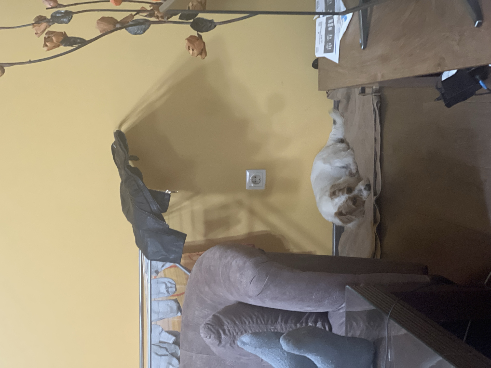 The image displays an interior residential scene in Belgrade, Serbia. On the left, a person's feet, clad in light blue socks, are propped on a section of a brown upholstered sofa, with a dark reflective coffee table in the immediate foreground. Behind the sofa, a metallic clothes drying rack is visible, holding several light grey garments. A dark jacket is draped over the top bar of this rack, casting a shadow on the light yellow wall behind it. Centrally located on the wall is a white European (Schuko Type F) electrical outlet. Below the outlet, a white and light brown mixed-breed dog lies resting or sleeping on a brown mat on the floor. To the right, a dark wooden table supports white papers and the stand of an electronic device. Decorative branches with dried, brown-orange floral elements partially frame the right side of the image. Electronic cables and a black power brick are visible on the floor beneath the table.