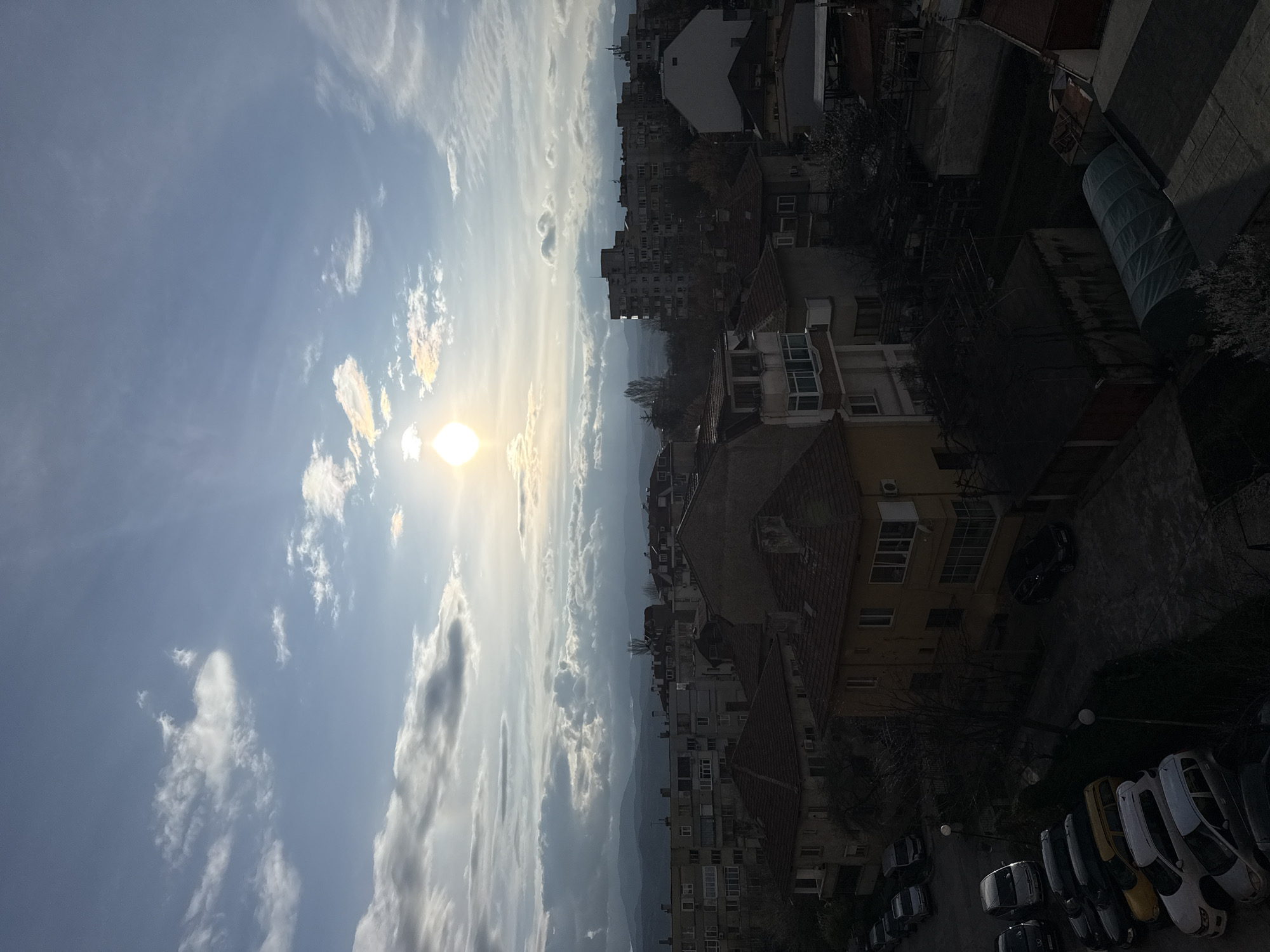 An aerial view oriented vertically shows an urban landscape under a sky with light clouds and a bright sun. In the foreground, a row of parked cars lines a street. Buildings with red-tiled roofs and beige walls rise towards the center of the frame. Further in the distance, dense clusters of apartment buildings can be seen. Low-lying hills and haze define the horizon. The location is Blagoevgrad, Bulgaria.