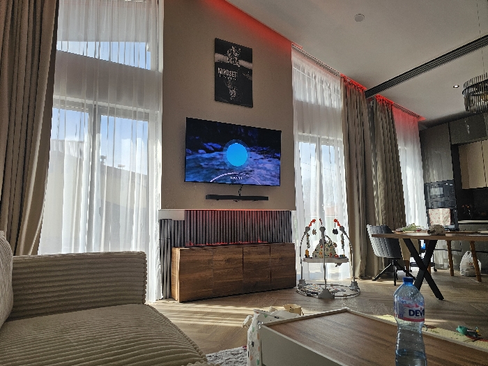 The image displays the interior of a modern, open-plan living and dining area located in Dragushinovo, Bulgaria. The room features light-colored walls and a light wood-patterned floor. Large, floor-to-ceiling windows with both sheer white and opaque beige curtains allow natural light into the space. Red LED strip lighting is integrated along the ceiling edges above the curtain rails. A wall-mounted television is centrally positioned, displaying a blue circular graphic on a dark background. Below the television is a dark soundbar, and beneath that, a dark wood console cabinet featuring vertical slat details. Above the TV, a framed piece of wall art with white text, possibly "MINUSET," is mounted. To the left foreground, the ribbed armrest of a light beige sofa is visible. In the midground to the right, a baby bouncer activity center with multiple colorful toys is situated on the floor. Further into the background, a dining area is equipped with a light wood table featuring dark X-shaped legs and dark grey upholstered chairs. Beyond the dining area, a modern kitchen is visible, comprising dark lower cabinetry, integrated appliances including an oven, and lighter upper cabinets. In the immediate foreground, a light-colored coffee table with a wood-toned top holds a partially full plastic bottle of "DEVI" brand water. No individuals are present within the scene.