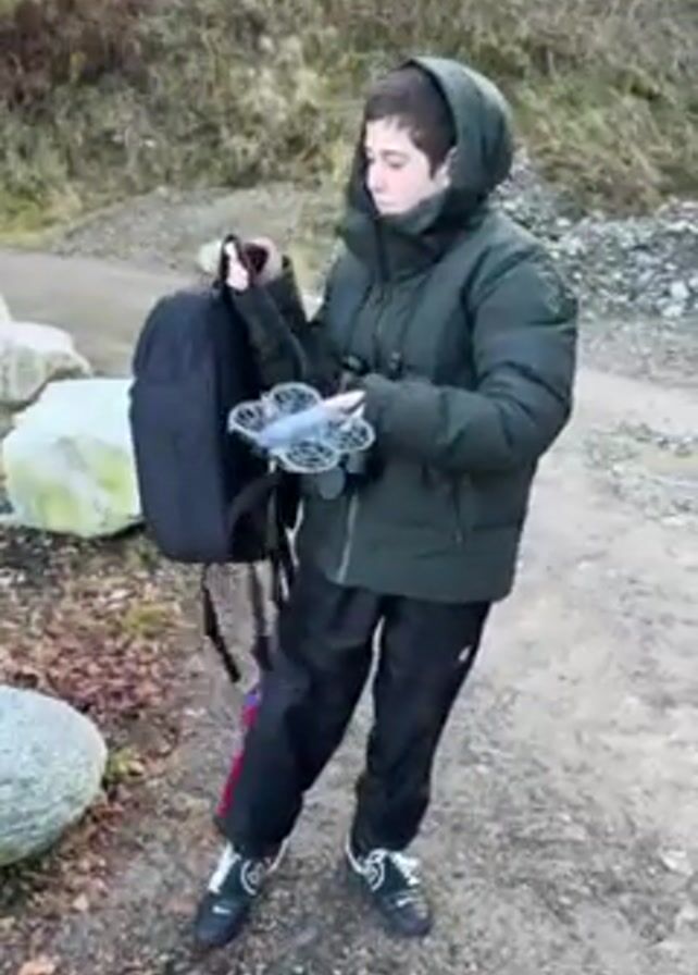 young person outside on a dirt path. They wear a dark green puffer jacket with the hood up, black athletic pants with stripes, and black and white athletic shoes. They have a black backpack on and a pair of binoculars hanging from the front of the jacket. The person is holding a small grey drone in their hands, examining it. To the left of the person is a large grey rock. Behind them, the path leads to a hillside covered in greenery.