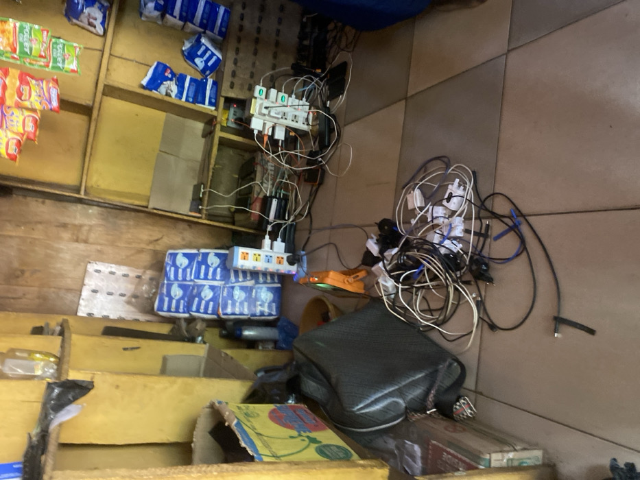 This image displays the interior of a small, cluttered commercial space in Okura, Nigeria