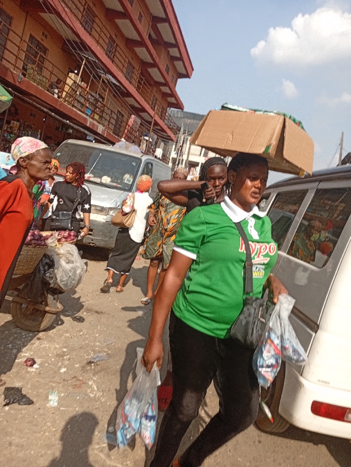 A busy outdoor scene features a woman in a green "Hypo" shirt and black pants carrying plastic bags. Another woman behind her balances a large cardboard box on her head. To the left, an older woman with a patterned headscarf stands beside a cart. Several people are visible in the background, along with two vans parked near a multi-story building with reddish-brown balconies. The street appears somewhat littered.