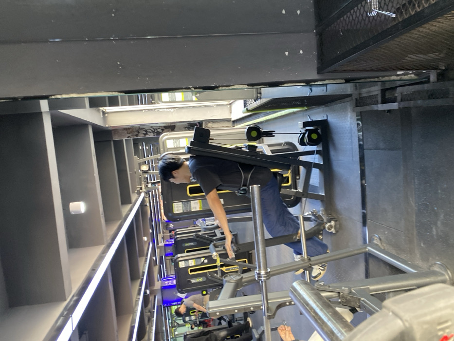 In a narrow gym setting, rows of weight machines line a wall. A man in a black shirt and jeans is actively using one of the machines. Behind him, there are other gym-goers working out. The space is brightly lit with LED lighting along the wall, highlighting the compact and functional design of the gym.