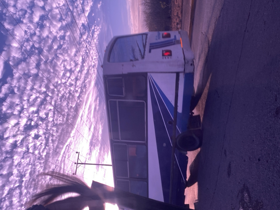 The scene depicts a late afternoon or early morning moment in El Dátil, Venezuela, characterized by a pervasive purple and pink ambient light. A white and blue bus, appearing weathered, travels from left to right on an asphalt road. The bus's rear-left side is visible, showing multiple dark-tinted windows along its body, a blue stripe with white angular accents, and dual red taillights and an orange light bar illuminating on its rear. The road surface exhibits cracks and variations in texture. To the far right, dry, sparse vegetation borders the road. Overhead, numerous power lines stretch across a sky filled with patterned altocumulus clouds. A dark, blurry, elongated object, possibly hair or fabric, is prominent in the immediate foreground on the left, suggesting a close-up perspective from a person or a moving vehicle. A utility pole with cross arms is visible in the mid-ground on the left, supporting overhead wires. No identifiable individuals are clearly visible within or outside the bus.