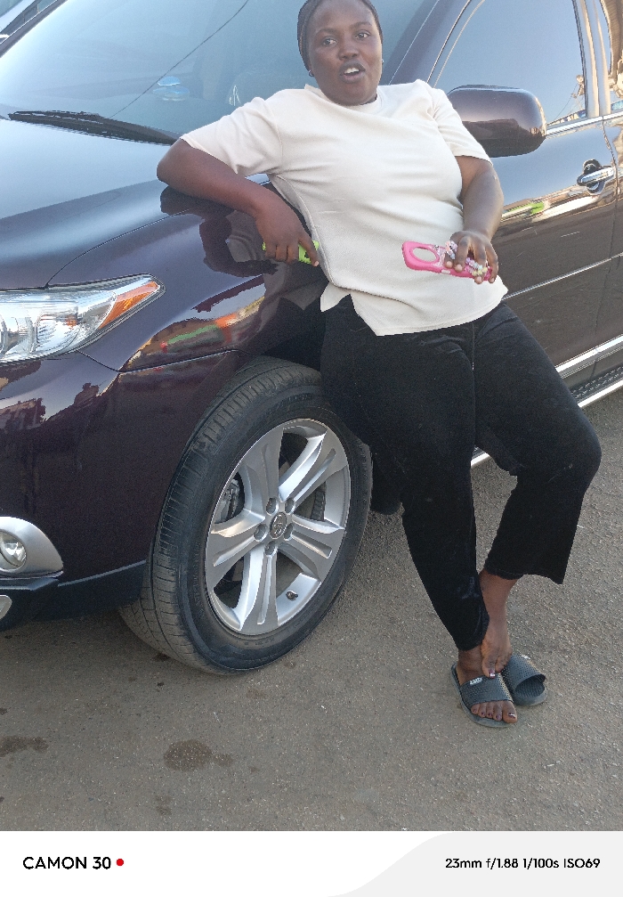 This image, taken in Jos, Nigeria, depicts an adult female standing outdoors and leaning against the front left fender of a dark maroon Lexus RX SUV. She is wearing a light-colored, short-sleeved top and black trousers. Her right arm rests on the vehicle's fender. Her left hand holds two objects: a green-yellow rectangular item and a pink, compact-like object adorned with beads. Her mouth is slightly open, and her gaze is directed slightly upwards and to her right. She wears dark slides/slippers on her feet, with her left foot partially out of the footwear. The SUV features a silver multi-spoke wheel, and its surface reflects elements of an urban environment. The ground beneath the vehicle is a paved surface exhibiting some discolorations.