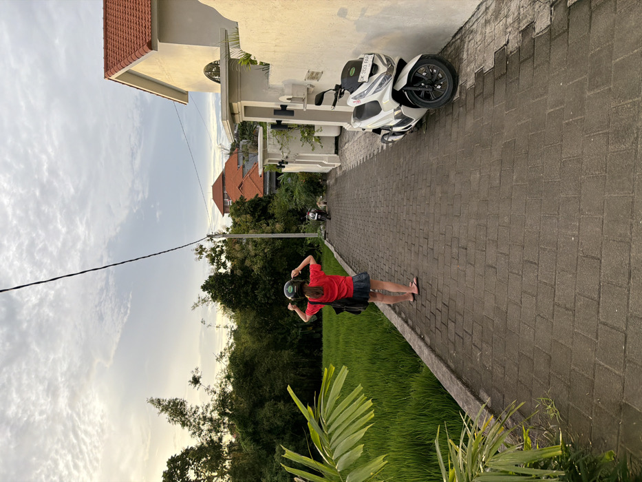 This image depicts a paved pathway in Canggu, Indonesia, observed during late afternoon or early evening. The path, composed of grey rectangular pavers, features a vibrant green rice paddy field along its left side, bordered by dense tropical foliage including trees and bamboo. A palm frond extends into the immediate foreground on the left. On the right, a white-walled building with a terracotta roof stands, partially illuminated by soft light. A white Honda PCX scooter, license plate DK 3333 FAR, is parked on the right side of the path, parallel to the building wall, facing away from the viewer. Further down the path, a dark-colored scooter is visible in the distance. Centrally located on the path, viewed from behind, is a single individual with long brown hair. This person is wearing a red short-sleeved t-shirt, a dark skirt, and black flip-flops. A black shoulder bag hangs from their left side. Their hands are raised, holding a dark green helmet near their head, indicating the action of either putting on or adjusting headwear. The sky above is partly cloudy, and a single black overhead cable stretches across the upper portion of the frame. In the background, additional structures with terracotta roofs are discernible amidst the trees.
