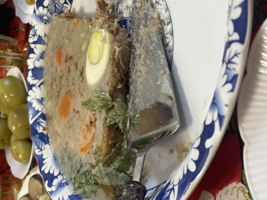 A jellied meat dish, likely aspic or head cheese, sits on a plate with a blue and white floral border