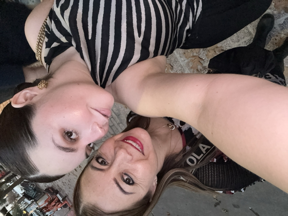 Two women pose closely together, their faces near. One woman wears a black and white striped top and has dark hair pulled back. The other woman has shoulder-length brown hair and is wearing a patterned shirt with "OLA" visible. Both women wear necklaces and earrings. A city scene is visible in the background and the ground is visible beneath them.