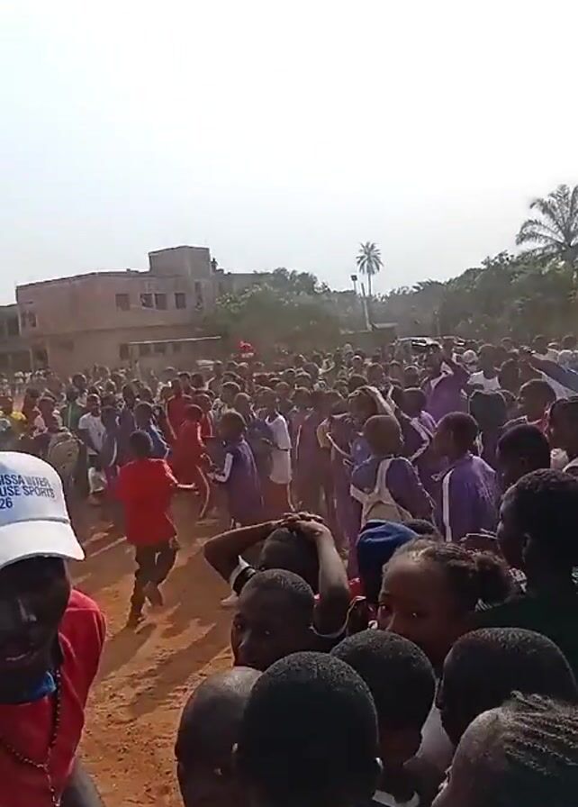 large crowd of children on a dirt field