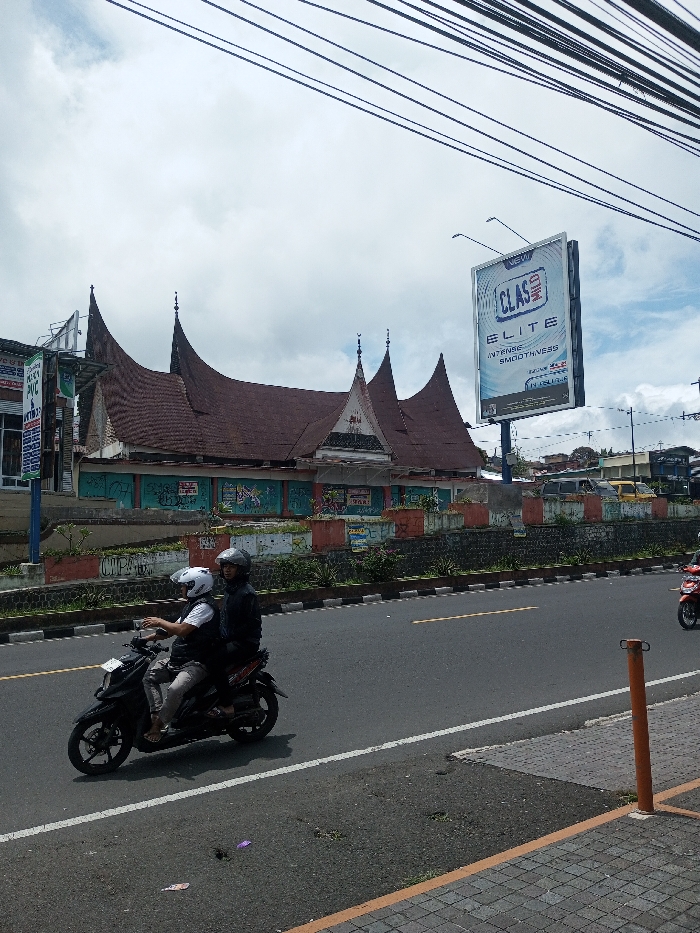A street view features a black motorcycle with two riders in helmets. Behind them, an older building with a brown roof and pointed gables stands next to a tall advertisement sign. Graffiti covers the building's lower facade. The road is visible in the foreground, with a sidewalk on the right. Overhead, electrical wires run across the top of the image, partially obscuring the cloudy sky.