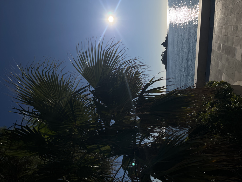 The image depicts a coastal scene in Petrovac na Moru, Montenegro, oriented towards the sea under a clear blue sky. In the foreground, a large palm tree, partially silhouetted, occupies the left side of the frame, with its green fronds extending downwards and to the right. Below the palm, dense green foliage is visible. A light-colored paved walkway or terrace, constructed from rectangular pavers, spans the lower right portion of the image, bordered by a low, light-colored concrete wall separating it from the water. The calm, blue sea dominates the midground. In the distance, two small islands are visible. The left island is larger and covered with trees, while the right island features a distinctive structure, identified as the Church of the Holy Sunday. The sun is positioned in the upper right quadrant of the sky, emitting a strong glare and lens flare, with its light reflecting as a shimmering path across the water's surface towards the viewer. No people are present.