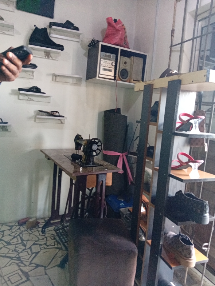 The image displays an interior setting with shoes arranged on shelves, both mounted on the wall and on a freestanding display rack. A sewing machine sits on a table near a gray cushioned stool. A cubby-like shelf holds a radio, speakers, and a pink shopping bag. A tall, cylindrical object, secured with a pink ribbon, is in the background. The floor has a patterned tile.