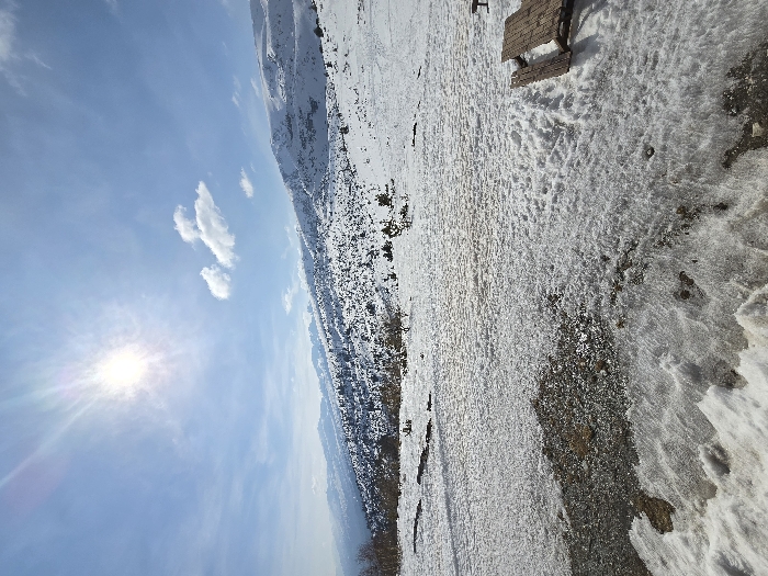 The image displays a winter mountainous landscape in the area of Panichishte, Bulgaria. The sky is predominantly clear blue, with a bright sun radiating light from the upper left quadrant and a few small, white cumulus clouds visible in the upper right. The foreground shows a patchy ground surface composed of snow and exposed dark gravel or dirt. A wooden picnic table, consisting of a tabletop and attached benches, is partially visible on the right side of the foreground, with snow accumulation on its surfaces. The midground and background are dominated by snow-covered rolling hills and mountains, dotted with scattered coniferous trees and bare deciduous vegetation. No individuals or active subjects are present in the scene.