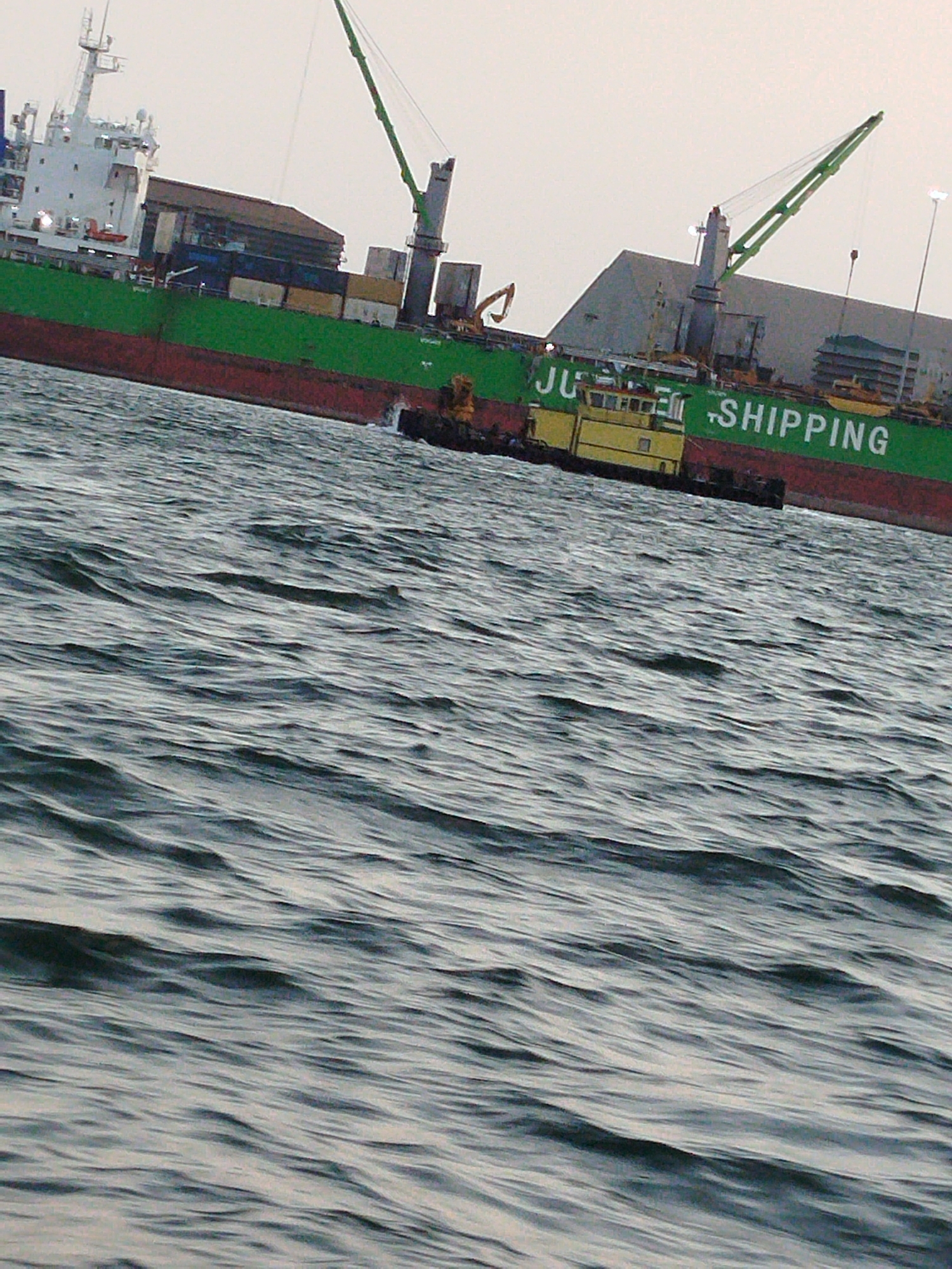 The image displays a maritime scene within a commercial port in Lagos, Nigeria, likely the Lagos Port Complex. A large cargo ship with a green hull and visible red bottom, identified by "JU-SHIPPING" text in white on its side, dominates the upper portion of the frame. The ship carries multiple stacked shipping containers and is equipped with at least two prominent green-colored cranes. A smaller, yellow-painted tugboat is positioned alongside the cargo ship, actively maneuvering and creating a white wake against the larger vessel's hull. The foreground and midground are filled with dark, rippling water. In the background, grey industrial buildings and tall light poles characteristic of port infrastructure are visible under an overcast sky. No human figures are clearly identifiable. The overall scene indicates active port operations involving vessel movement.