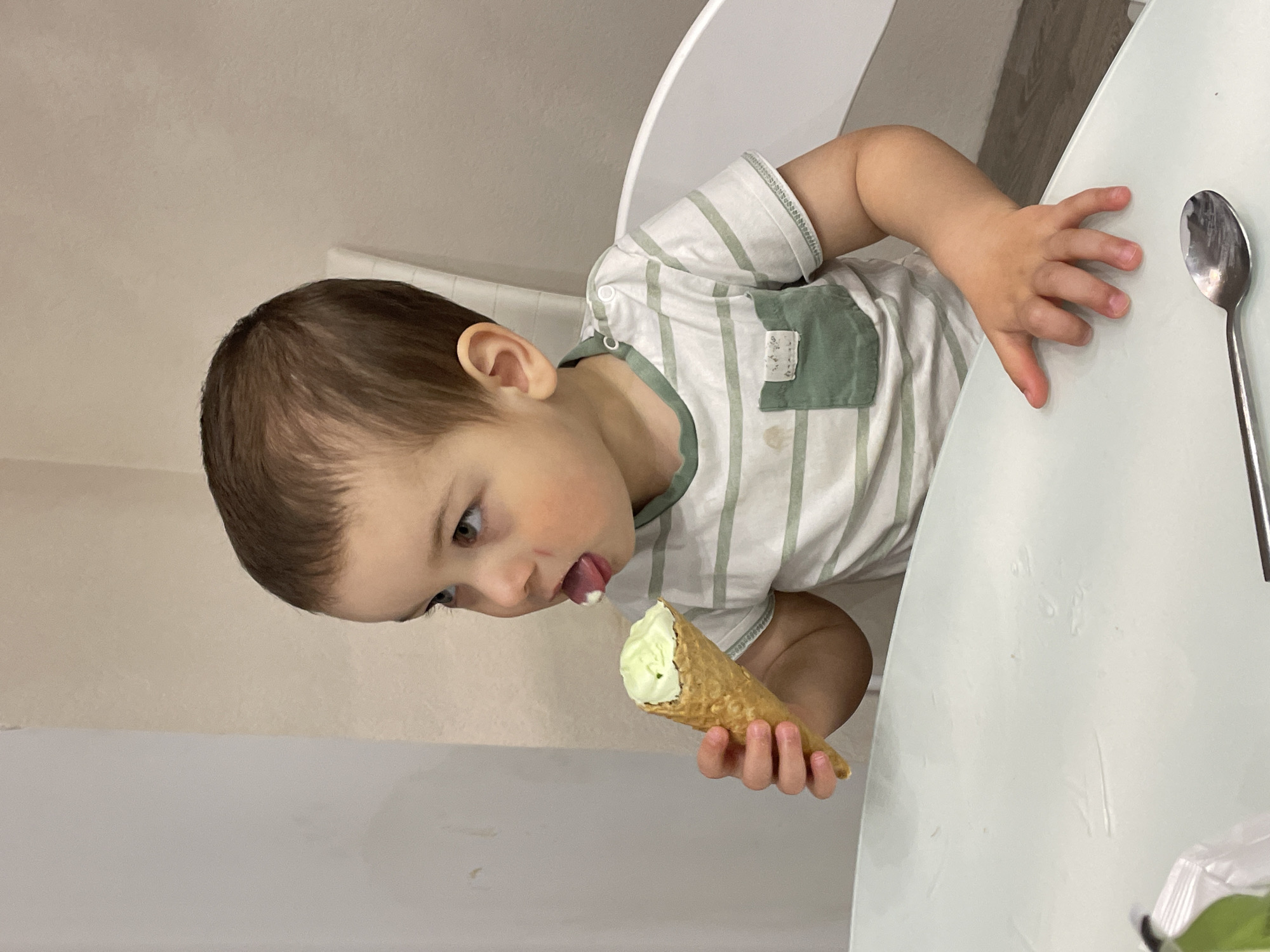 - "A young child is seated at a white table, holding and eating an ice cream cone with a green filling" by FM-DXeJt2, licensed under CC BY 4.0