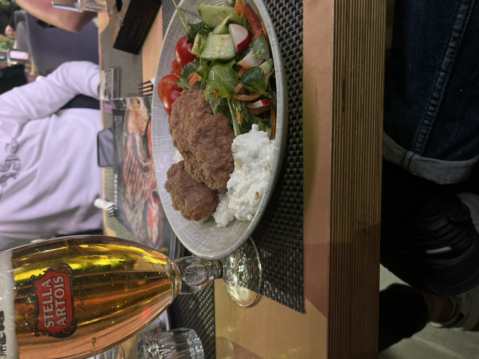 The image depicts an indoor dining scene at a restaurant in Plovdiv, Bulgaria. In the foreground, a light brown wooden table is set. On a dark grey woven placemat, a tall, stemmed glass of Stella Artois beer with a golden liquid and a foamy head is positioned on the left. Adjacent to the beer glass, a light grey bowl holds a meal composed of three breaded, fried meat portions (possibly *kyufte*), served on a bed of white granular material, alongside a dollop of white creamy sauce, and a fresh side salad. The salad contains green leafy vegetables, sliced cucumbers, sliced radishes, shredded carrots, and several halved red tomatoes. A silver fork rests to the right of the food bowl. Behind the meal, a menu featuring a picture of a grilled steak is partially visible, next to which sits a dark, rectangular object, possibly a napkin holder or condiment caddy. Seated across the table from the camera is a person wearing a white long-sleeved shirt with a dark, indistinct graphic on the chest. The lower half of their torso and arms are visible. Below the table, the legs of the person taking the photograph are visible: one leg in dark trousers with a white and black sneaker, and another leg in blue denim jeans with a rolled cuff and a dark shoe. The background is softly blurred, revealing ambient restaurant lighting, indistinct figures of other patrons, and general dining furniture, suggesting an active restaurant environment.