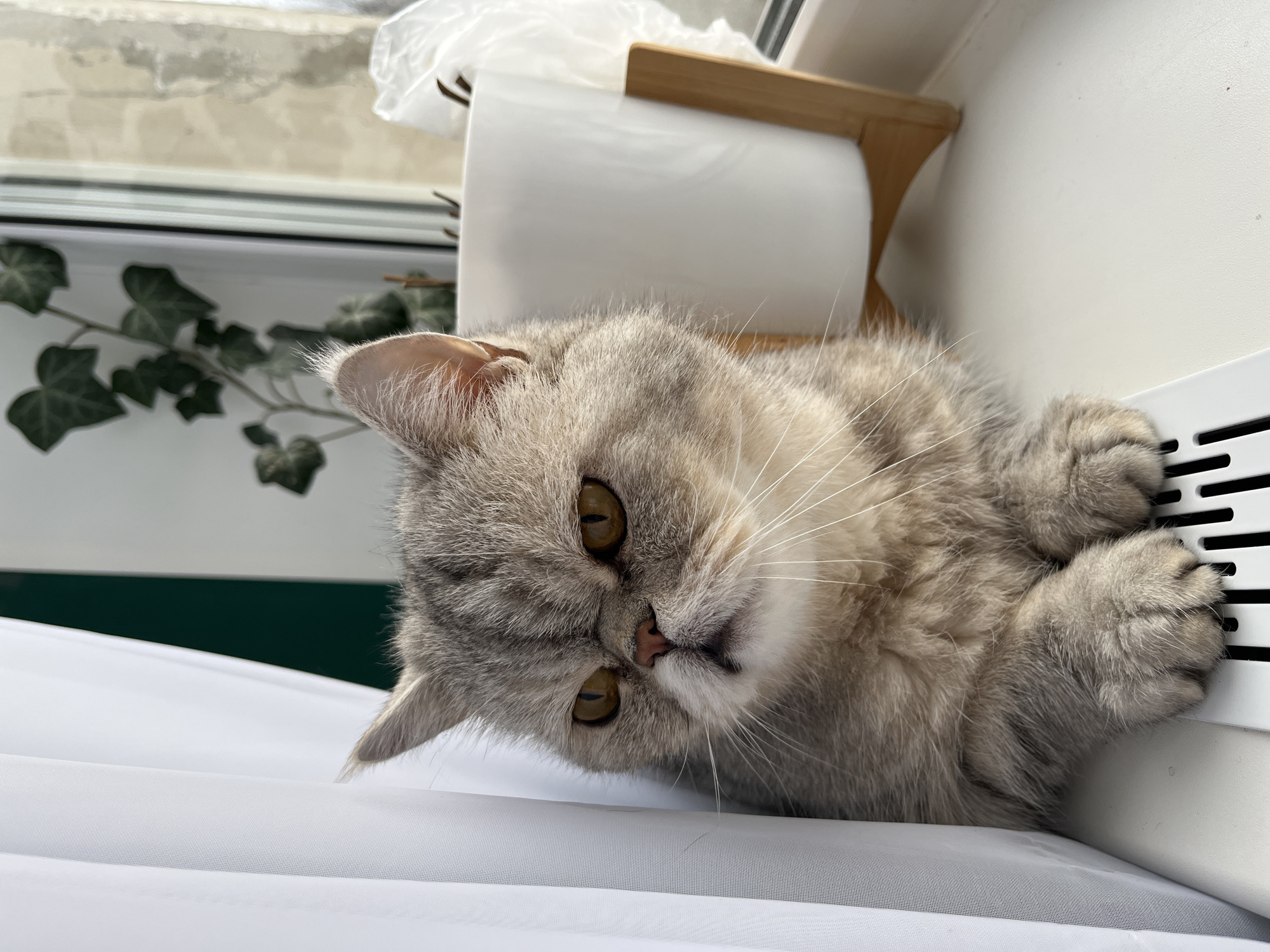 A gray tabby cat is lying on a white surface, possibly a bed or draped fabric, near a window. The cat is positioned close to a radiator, with its paws touching the surface. A roll of paper towels rests on a wooden holder next to the cat. Outside the window, there's greenery, possibly ivy, and a blurred view of the external environment. The photo may have been taken in an indoor setting in Chaikovsky, Russia, but without additional context, the location is not possible to confirm.