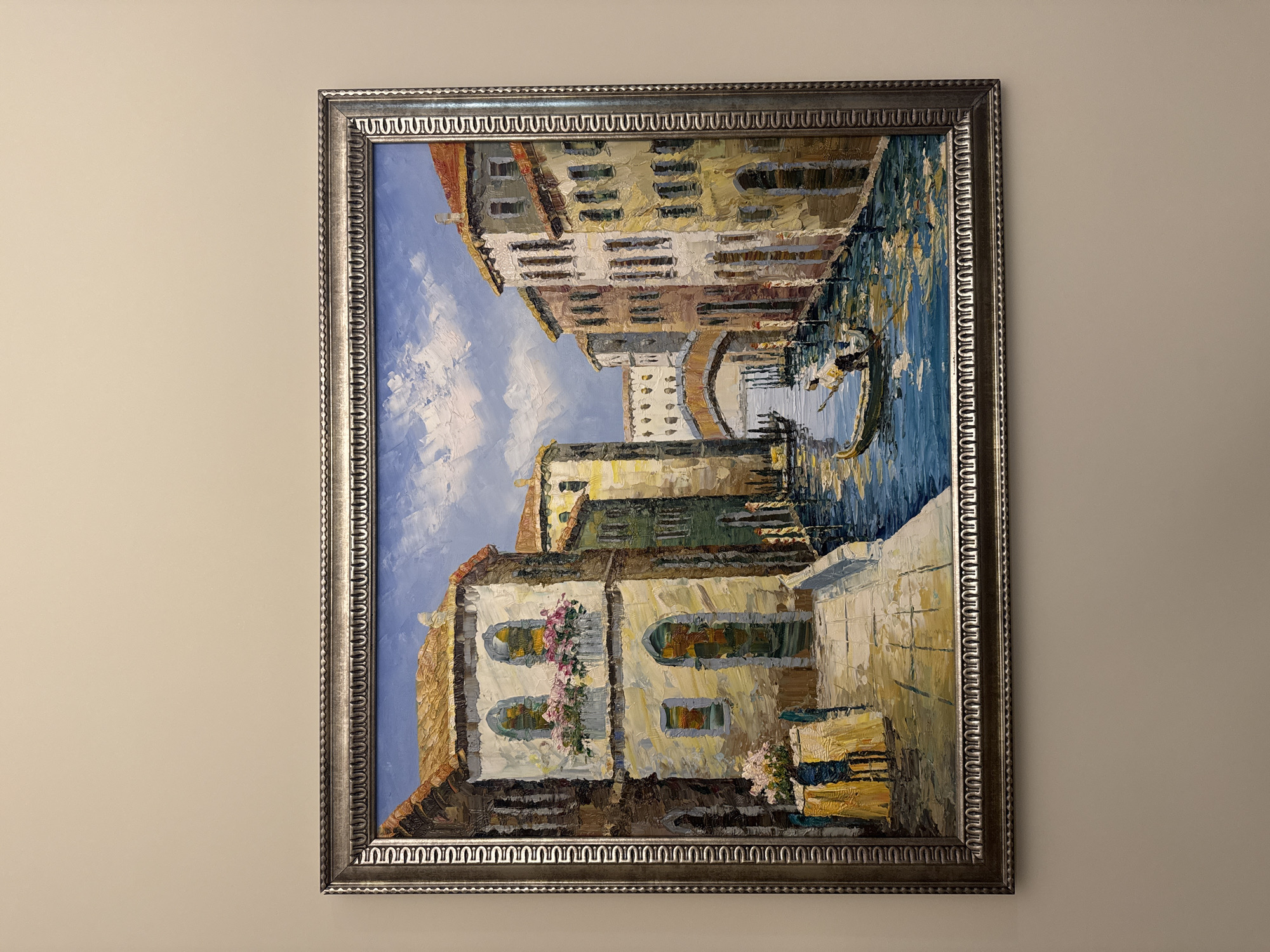 The image displays an oil painting with a textured, impasto style, framed and mounted centrally on a plain, light beige wall