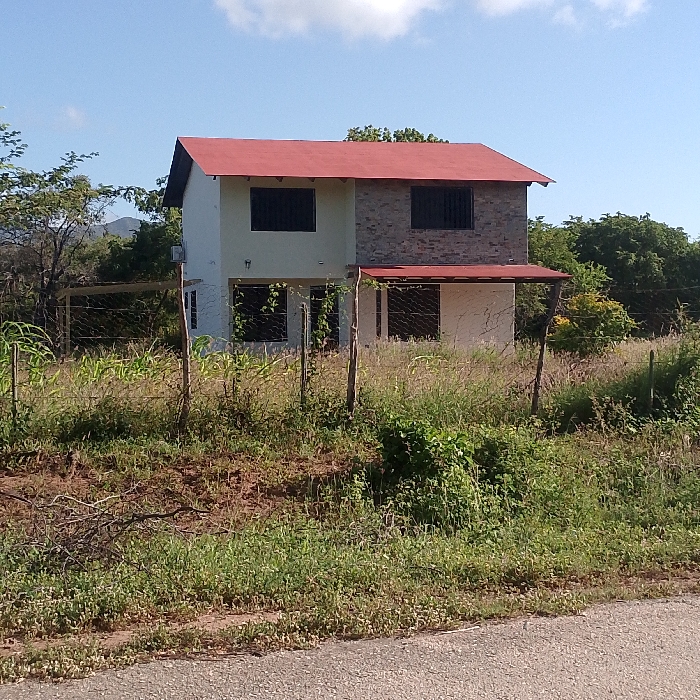 A two-story house with a red roof stands amidst overgrown vegetation behind a wire fence