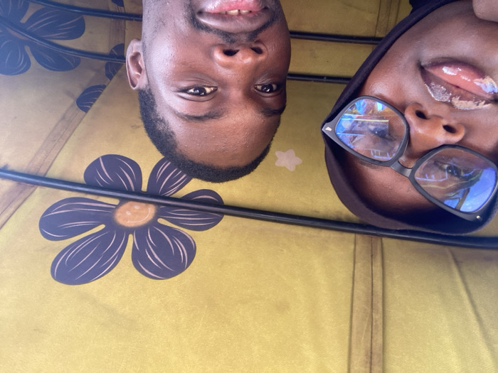 Two individuals pose upside down against a vibrant yellow floral background. On the left, a man with short dark hair looks directly at the camera. To the right, a person wearing glasses and a hijab is also looking at the camera, with glossy lips that catch the light. A black metallic bar horizontally bisects the frame, creating a compositional element. The overall impression is a playful and unconventional selfie or portrait.