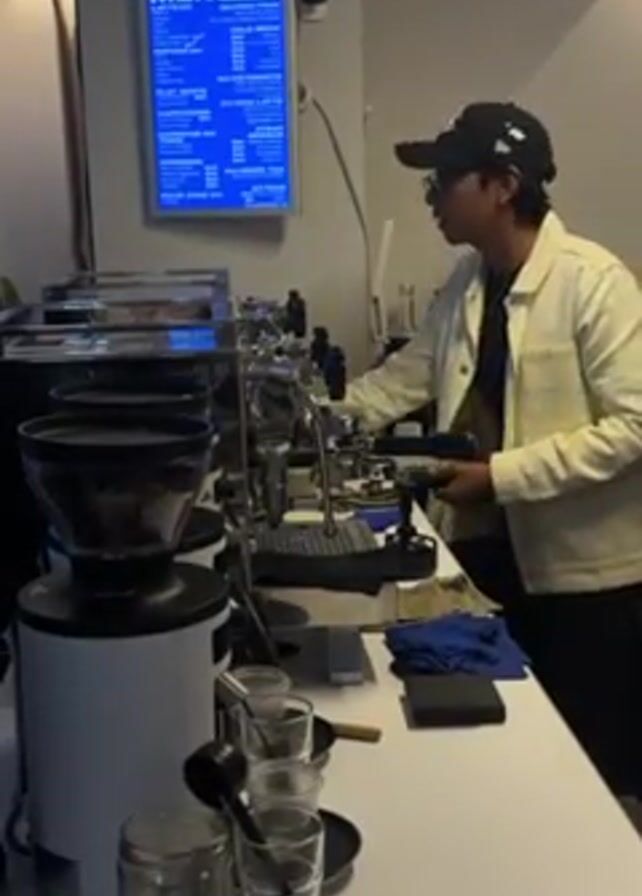 person in a coffee shop setting. The person is wearing a black baseball cap, glasses, a white jacket, and dark pants. They are standing behind a counter with various coffee-making equipment. To the left, there's a coffee grinder filled with beans. In front of them is a professional espresso machine, glasses, and other accessories. The person is focused on operating the espresso machine. On the wall behind them, there's a blue-lit menu board listing coffee options. A MacBook is visible on the right side of the counter, with a "Dense" sticker on it. The lighting in the room is dim, and the atmosphere appears calm.