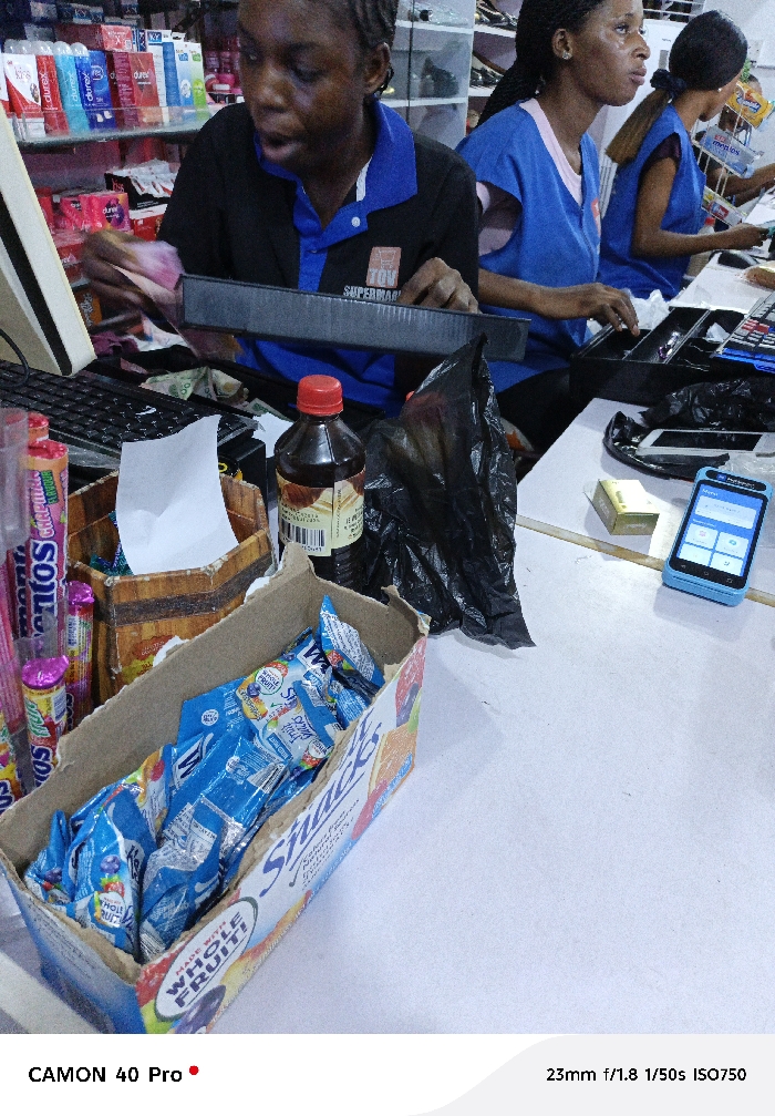 Three female shop assistants are working behind a counter in a store. The first woman is counting money from a cash box. The second woman is operating a point-of-sale system. In the foreground, a cardboard box filled with snack bars labeled "Snacks" sits beside a bottle of liquid, a dispenser with candy, and a black trash bag. A point-of-sale device is on the white counter. Shelves filled with retail goods, including condoms, are in the background.
