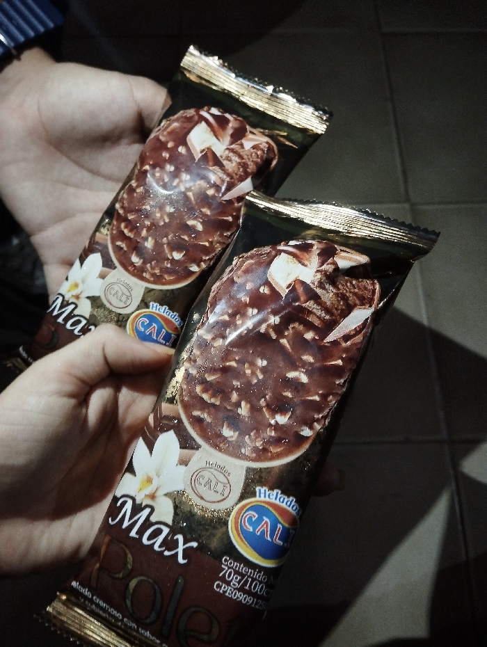 Two hands hold two identical chocolate-covered ice cream bars. The packaging is primarily brown and gold, showcasing an image of the round ice cream bar covered in chocolate and nuts, topped with swirls of white chocolate. The brand name "Max Pole" is prominently displayed alongside a white vanilla flower. The logo "Helados CALI" is present in blue and yellow, indicating the manufacturer. The packaging also mentions a net weight of 70g/100cc and a code "CPE0909125". The crinkled foil top indicates the bars are ready to be opened and consumed.