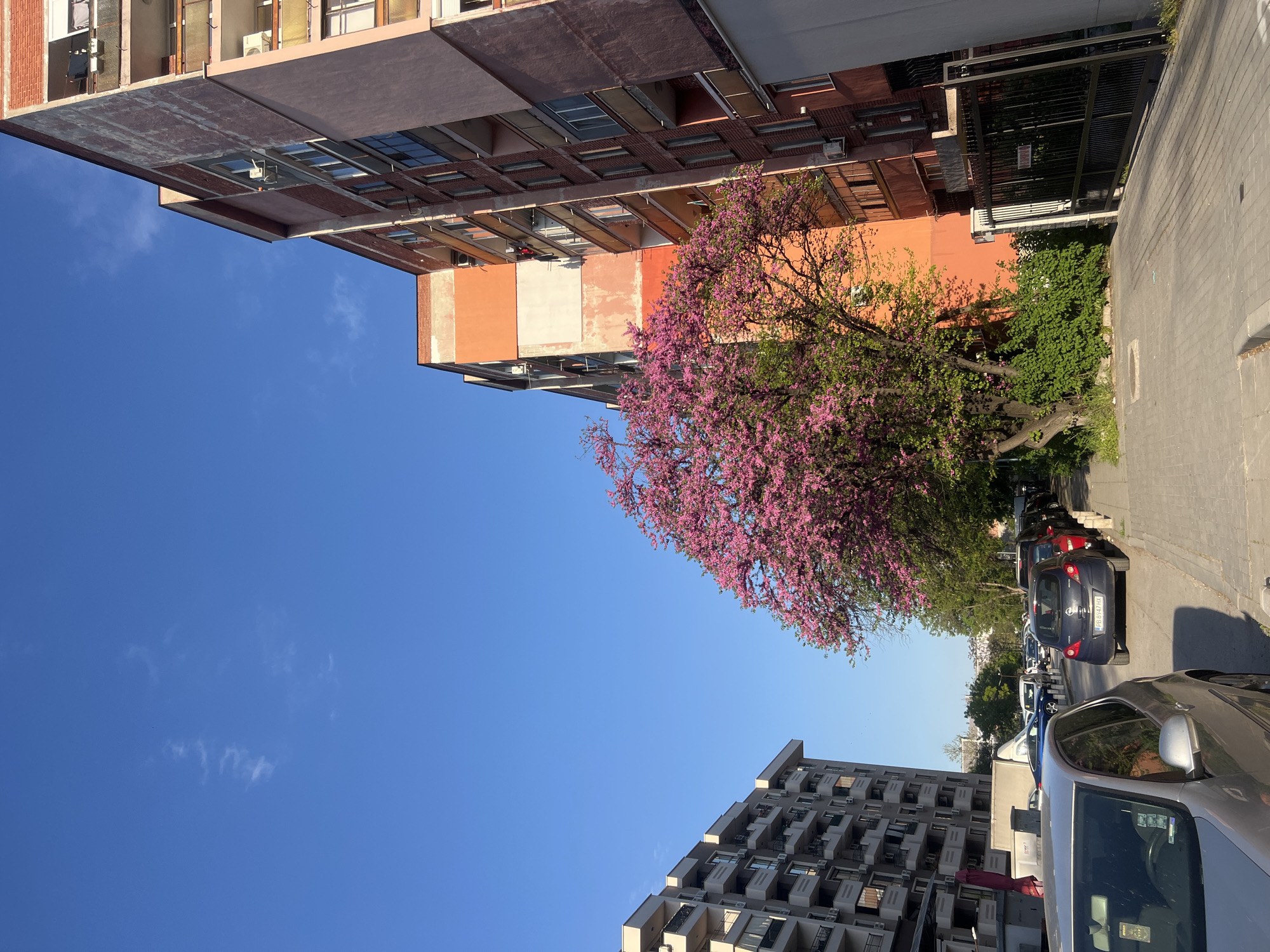street scene in Plovdiv, Bulgaria. The view is from a low angle, looking upwards at buildings and the sky. The sky is bright blue with sparse clouds. The buildings are residential, with multiple stories and balconies. One building is a reddish-brown color and the other is beige. A tree with vibrant pink flowers is prominent in the middle ground. Cars are parked along the side of the street.