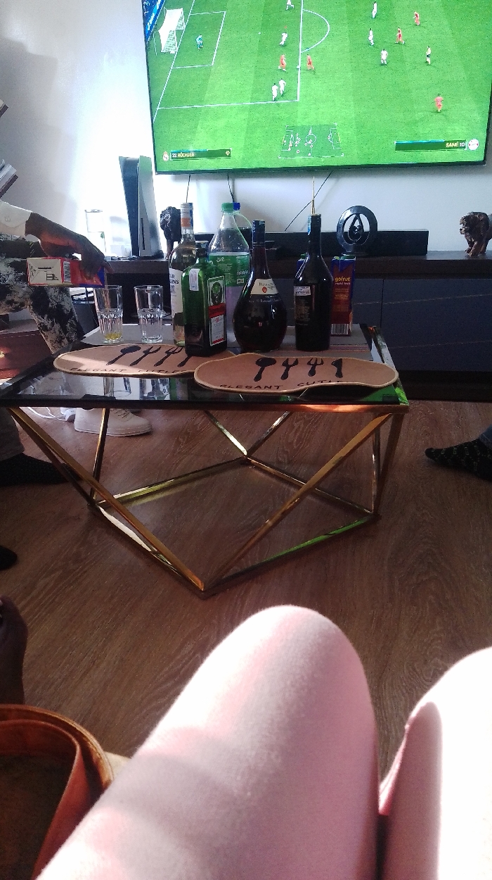 The image depicts an indoor scene, likely a living room or entertainment area, in a domestic setting within Nairobi, Kenya. The precise location within the city cannot be determined from the visual information provided. The scene is viewed from a low perspective, possibly from a seated position. In the immediate foreground, the upper thighs and knees of an individual are visible, clad in light pink, possibly fleece-like, loungewear. A brown strap or bag is partially visible near the left thigh. A central element is a modern coffee table with a glass top and a gold-colored, geometric metal frame. On the coffee table, a collection of bottles is arranged: a clear bottle labeled "FOUR COUSINS," a green Jägermeister bottle, a large clear plastic bottle of soda, two dark-colored bottles (one resembling a brandy bottle), and a "GoLfruit multi-fruit" juice carton. Two clear glass tumblers are also present, one partially filled. An arm with dark skin is visible on the left, holding a small red and white carton and actively pouring liquid into one of the tumblers. Two beige, irregularly shaped placemats with black cutlery designs and the text "ELEGANT CUTLERY" are under the bottles. In the background, a large flat-screen television is mounted on a light-colored wall, displaying a football (soccer) video game with a green pitch and multiple player figures. The game interface shows text including "22 HÖCHER" and "SANÉ 10." Below the television is a dark-colored entertainment unit. A white PlayStation 5 console stands vertically to the left of the TV. A black soundbar or speaker is positioned on the entertainment unit, and a small, dark decorative object (possibly a sculpture) is visible on the right side of the unit. Under the coffee table, a pair of white sneakers is visible on the left, and a foot clad in a dark, patterned sock is partially visible on the right, indicating the presence of at least three individuals in the room. The flooring is light brown, appearing to be wood or laminate. The lighting in the room is bright, suggesting either ample natural light or strong artificial illumination.