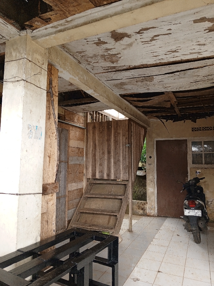 The scene depicts a semi-enclosed outdoor space, likely a porch or carport, in Pacet, Indonesia. The overhead structure consists of concrete beams supporting a wooden plank ceiling with extensive peeling white paint, revealing dark wood and significant deterioration. A prominent light-colored concrete column stands on the left, exhibiting some staining and wrapped with thin horizontal wires. A weathered, natural wood plank is integrated vertically alongside this column. Adjacent to the column, a wall is constructed from horizontal wooden planks of varying tones, transitioning into a vertical wooden partition. Leaning against this partition is a crude, unpainted wooden structure resembling a short set of stairs or a ramp, featuring two visible risers and a flat top. To the right, a dark-colored scooter is parked, displaying license plate F 6172 CS, with "12-25" below. The scooter is positioned against a beige-colored wall with a dark brown entry door and a small, multi-paned window situated above a horizontal vent. The floor is tiled with alternating light and dark grey square patterns. In the bottom-left foreground, a black, rectangular metal frame or stand is partially visible. Green foliage can be seen beyond the wooden partition, suggesting an adjacent outdoor area. No individuals are present.
