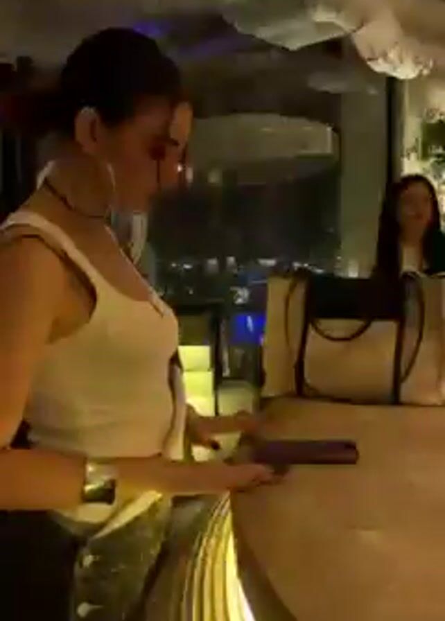 A woman stands at a bar in an indoor establishment. She has her hair tied back in a bun and is wearing a white tank top and dark pants. She is looking down and appears to be interacting with something in her hands, possibly a phone. Behind the bar, there is a large bag and another woman sitting. The background is illuminated with varying colors of light, and there are decorative elements hanging from the ceiling.