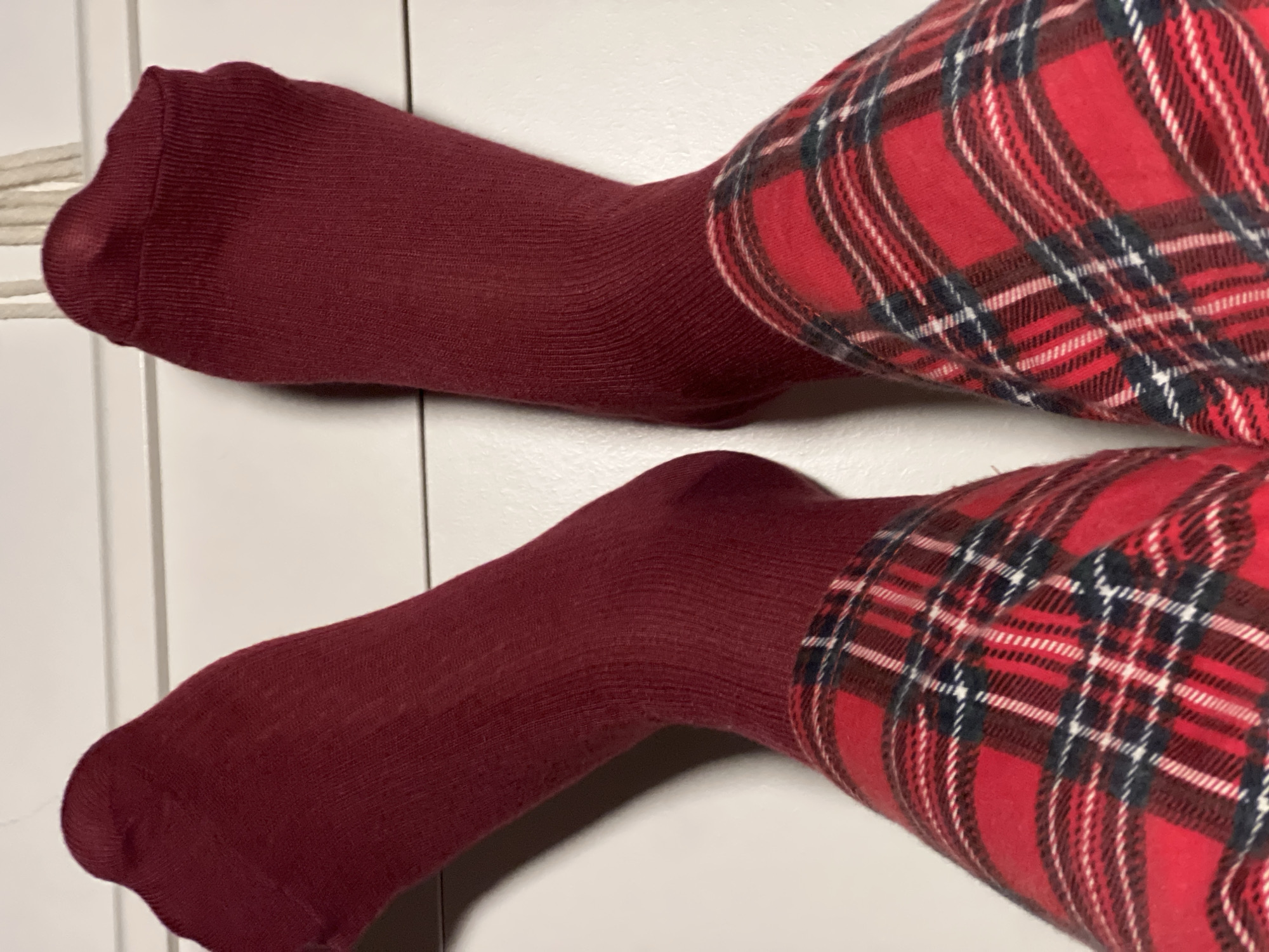 Two legs are positioned against a white door. Each leg is covered with a maroon sock extending up to the lower calf. Above the sock, each leg is covered in a red and black plaid pattern, suggesting pants or leggings. No identifying details pinpoint the image's location in Kiryat Bialik, Israel.
