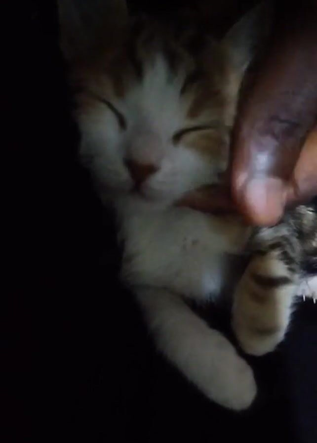 A person's hand gently touches the face of a sleeping kitten. The kitten is light-colored with some brown markings. The kitten's eyes are closed and it is lying on a dark surface, likely black clothing or fabric. The lighting is dim. The person moves their hand, and the kitten shifts position slightly, showing more of its back. The focus blurs.