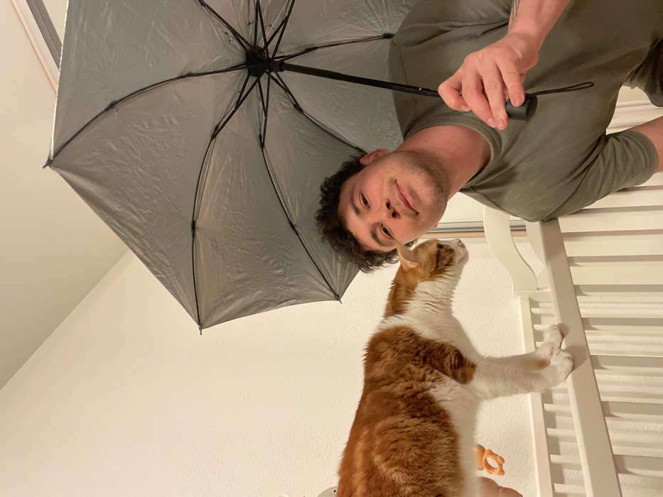 - "A man in an olive green shirt holds a closed grey umbrella above his head and next to a white-and-orange cat that is clinging to the bars of what appears to be a crib" by FM-aSEY13, licensed under CC BY 4.0