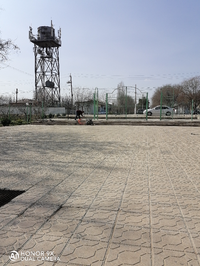This image depicts an outdoor urban scene in Samarkand, Uzbekistan, under clear daytime conditions. The foreground is a wide expanse of light-colored paving stones arranged in a geometric pattern incorporating octagonal and rectangular shapes. A dark, irregular shadow extends from the lower-left corner across a portion of these pavers. In the mid-ground, a green metal fence with decorative arched sections runs horizontally across the frame. Behind this fence, a single male individual is visible, dressed in dark clothing. He is bent over, interacting with a small, dark-colored mechanical object on the ground that has a red or orange component. This object is positioned on a raised paved area or curb just behind the fence line. Further into the background, a road is visible with a white sedan, possibly a Chevrolet, parked or moving slowly on the right side. Several low-rise buildings with light-colored walls and tiled roofs are scattered behind the road and fence. Bare deciduous trees with minimal foliage indicate a dormant season. A prominent feature in the left background is a tall, dark-colored lattice-structure metal tower, likely a water tower, topped with a cylindrical tank. Multiple antennae and communication equipment are affixed to the top and sides of this tower. Utility poles and overhead wires are visible throughout the mid-ground and background. The sky is bright and largely cloudless.