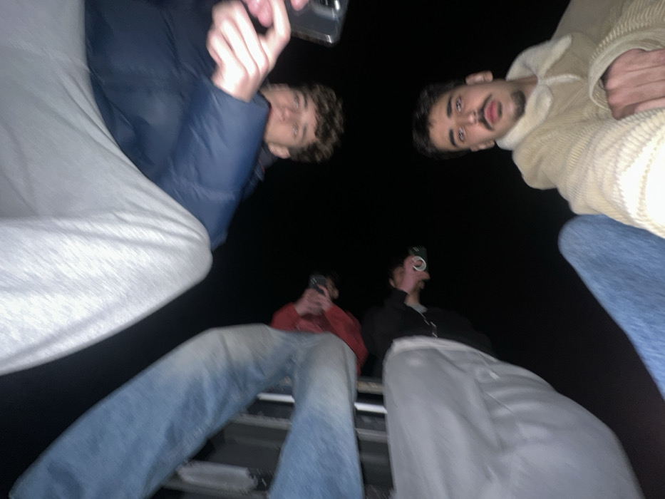 This image depicts a low-angle shot of four young adult males in Mirandela, Portugal, against a uniformly dark background, indicating nighttime or an unlit environment. The foreground, bottom right, features a male with dark hair, a mustache, and a short beard, wearing a beige corduroy jacket with a cream fleece collar and blue jeans. He looks directly at the camera. Above him, another male with curly dark hair wears a dark blue puffer jacket and holds a smartphone in his right hand, angled towards the camera. To the left, a third male, partially obscured, wears blue jeans and a red long-sleeved shirt, holding an unidentifiable dark object. Further left, a fourth male, also partially obscured, wears light-colored pants and a dark top, holding a silver-colored beverage can. All individuals are looking downwards towards the camera, suggesting a group photograph or selfie taken from below. The image exhibits blur, consistent with low-light conditions or slight subject movement. No specific landmarks or environmental features of Mirandela are discernible from the visual content.