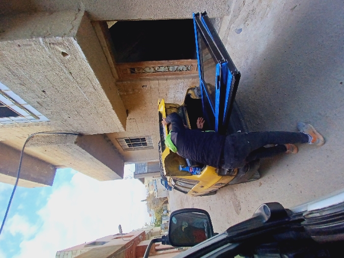 The image captures a street scene in Kafr Sousa Municipality, Syria. In the midground, a person, viewed from behind, is actively loading multiple dark-framed windows with blue-edged frames into the open trunk of a yellow sedan. The individual wears a dark jacket with a green detail on the collar or hood, dark pants, and light-colored athletic shoes with orange accents. A blue spray bottle is visible inside the trunk of the yellow vehicle, which is parked on an asphalt surface. Immediately behind the car, a multi-story building constructed of light-colored, rough-textured concrete or stucco stands, featuring a barred window and an ornate wooden door at ground level, with exposed electrical conduit running along its exterior. The sky above is partly cloudy. In the left foreground, a partial view of a dark vehicle's side mirror is visible, while other buildings and a street light pole can be seen further down the street in the background.