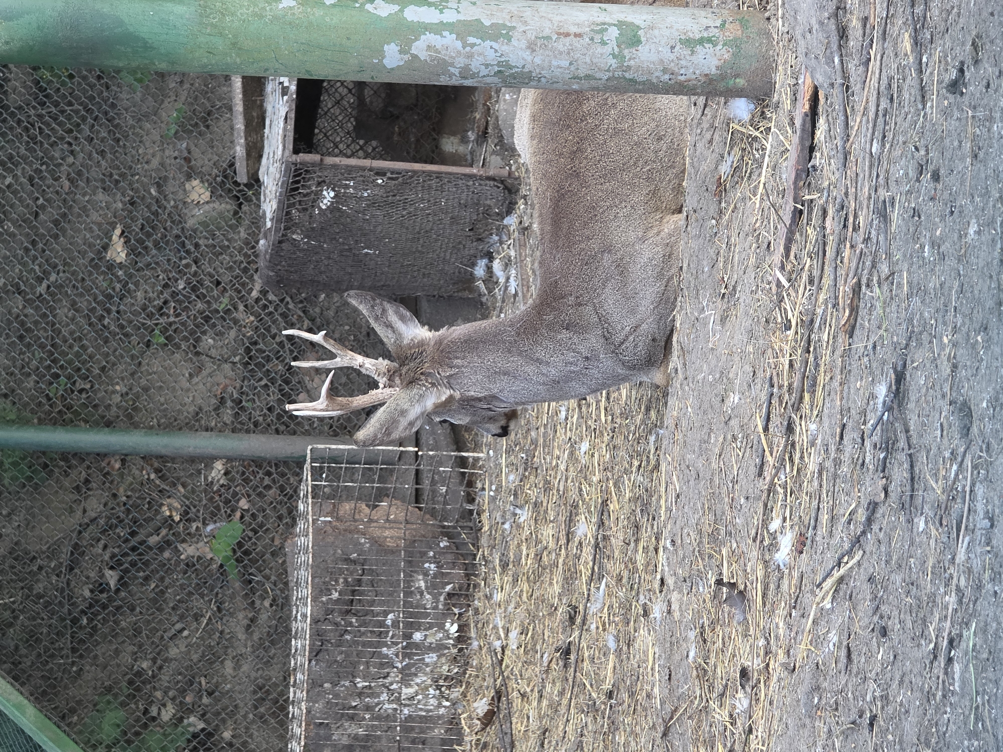 - "A deer with small antlers stands in an enclosure near a metal fence and a green, chipped metal beam" by FM-moJH62, licensed under CC BY 4.0