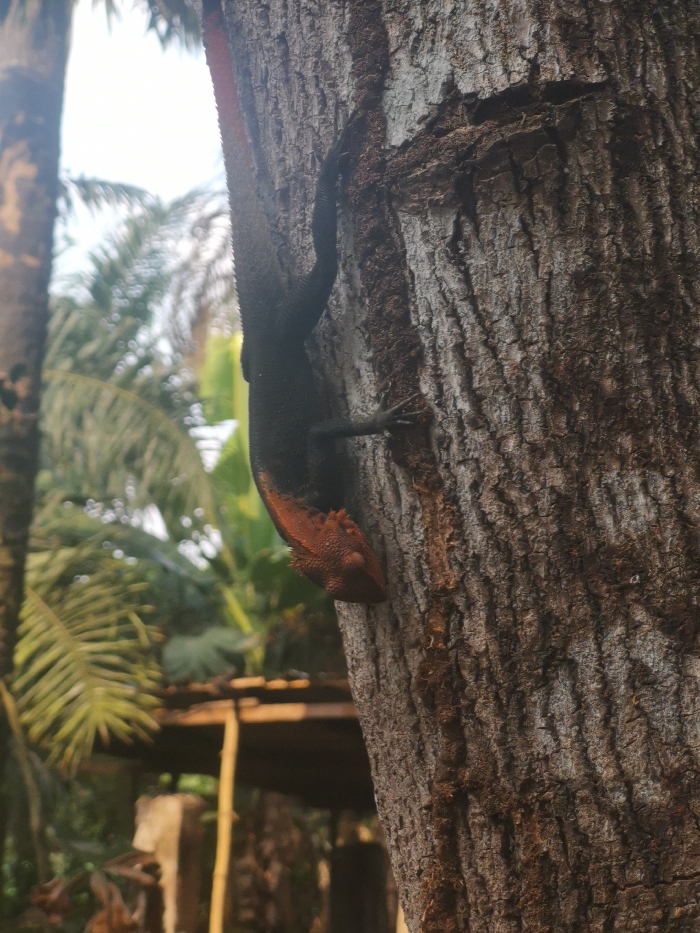 - "An agama lizard, characterized by its dark body and distinct reddish-orange head, is observed clinging vertically, head-down, to the rough, textured bark of a large tree" by FM-t8Vzk1, licensed under CC BY 4.0