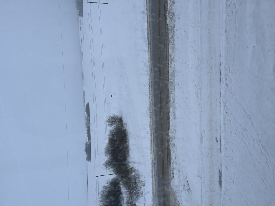 An aerial view shows a winter landscape. A grey road cuts through the snow-covered ground. Power lines stretch across a field to the left of the road. Trees are visible on the left side of the frame. The landscape is dominated by shades of white, grey, and brown. The image appears to be taken through a window, with slight distortions visible.