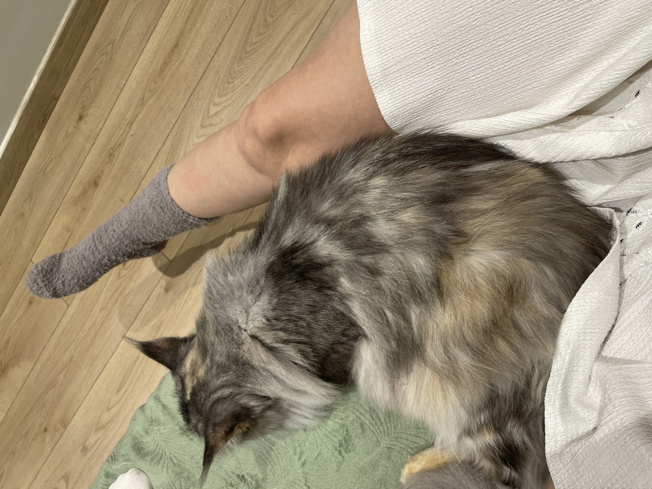 - "A long-haired tortoiseshell cat sleeps soundly on a green blanket, its head nestled near a person's leg" by FM-HSuMn2, licensed under CC BY 4.0