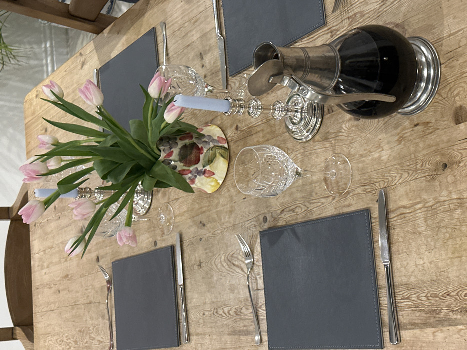 A table setting includes four gray placemats with utensils placed beside them. A vase with pink tulips is centrally positioned. Two crystal wine glasses are placed diagonally from the vase. A silver candlestick with a light blue candle sits near the vase. A silver wine decanter is situated on the opposite side of the tulip vase. The table is made of light-colored wood.