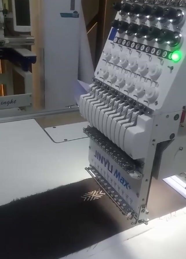 n embroidery machine, specifically a JINYU MAX+, at work on a piece of dark-colored fabric