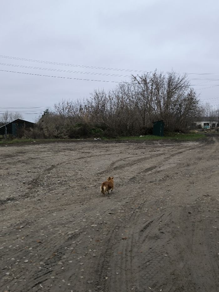 The scene, located in Parkhomivka, Ukraine, depicts an expansive unpaved area under an overcast, light grey sky. The ground consists of damp, light brown earth and gravel, heavily marked with tire tracks from multiple vehicles. In the lower-middle frame, a small, short-haired dog with reddish-brown fur walks away from the viewer towards the background, its tail visible. The background features a dense line of bare, deciduous trees and bushes. To the far left, a dark-colored building with a sloped roof is partially visible behind the vegetation. Further right, a small, dark green rectangular outhouse or shed stands partially obscured by the barren foliage. In the far right background, faint residential structures are discernible. Three parallel power lines traverse the upper mid-ground of the image.