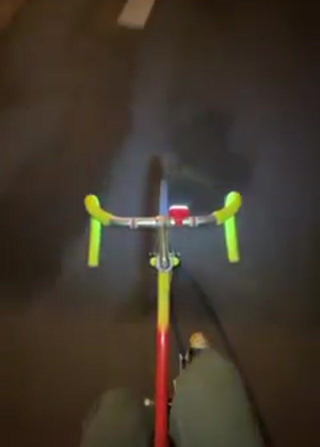 first-person view of someone riding a bicycle at night. The bicycle has a red, yellow, and silver frame, with neon green handlebar grips. The rider is wearing green pants and black shoes. The road is dark, but illuminated by the bicycle's headlight. There are some white lines painted on the road. The cyclist is passing by a stationary, similar bicycle.