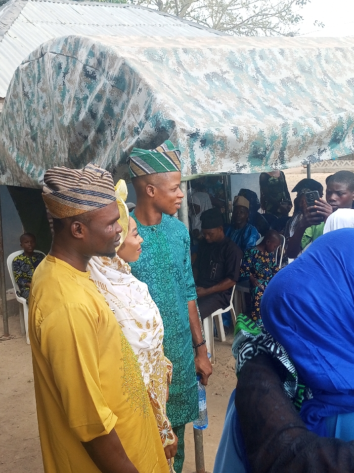 An outdoor gathering in Erin-osun, Nigeria, is depicted under a makeshift shelter with a camouflage-patterned fabric roof