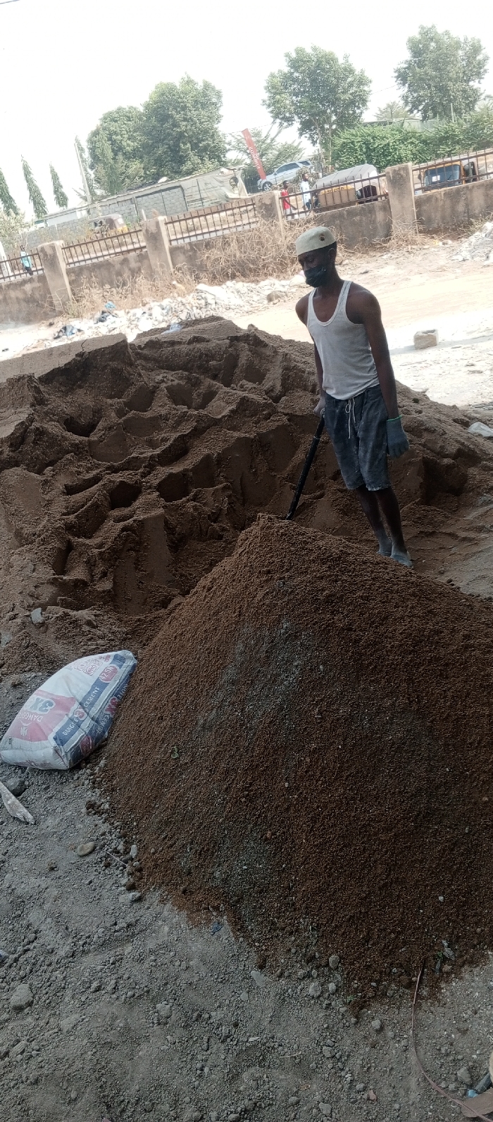 An outdoor scene in Dushepe, Nigeria, depicts a dark-skinned adult male standing amidst piles of reddish-brown granular material. The individual is positioned slightly right of center, wearing a white sleeveless undershirt, dark shorts, light grey work gloves, and a light-colored cap. A dark mask covers his mouth and nose. He holds a black-handled shovel, with its blade inserted into a mound of the granular material in the foreground. To the left of this mound, a white bag labeled "DANGOTE CEMENT" with red and blue markings rests on the uneven, light-grey ground, which is composed of dirt and small stones. A larger, irregular mound of the reddish-brown granular material extends across the mid-ground. In the background, a low concrete wall with metal railings separates the immediate work area from a street or open area. Beyond this barrier, sparse structures, green deciduous and coniferous trees, a silver car, and other vehicles are visible under a bright, clear sky. A black electrical wire runs along the ground in the lower right corner.