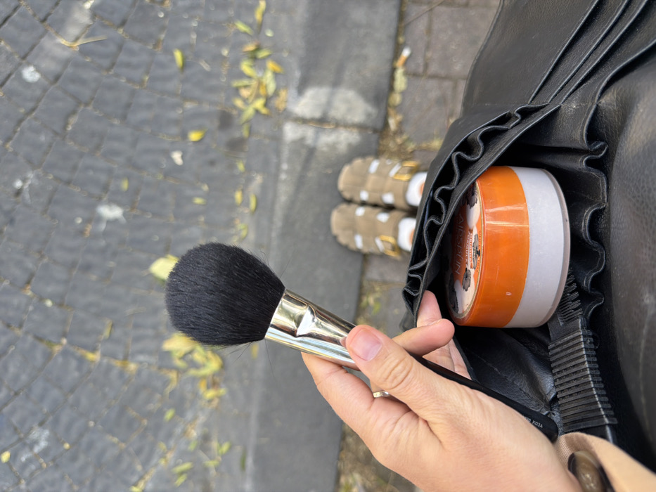 A first-person, downward-facing shot captures a left hand holding a black makeup brush with a silver ferrule