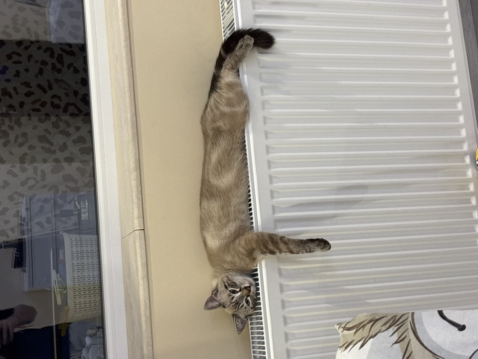 - "An interior scene in Radilovo, Bulgaria, depicts a domestic shorthair cat with light brown fur and distinct tabby markings, including a dark tail and paws, horizontally stretched across the top of a white, vertically-ribbed panel radiator" by FM-18TYr2, licensed under CC BY 4.0